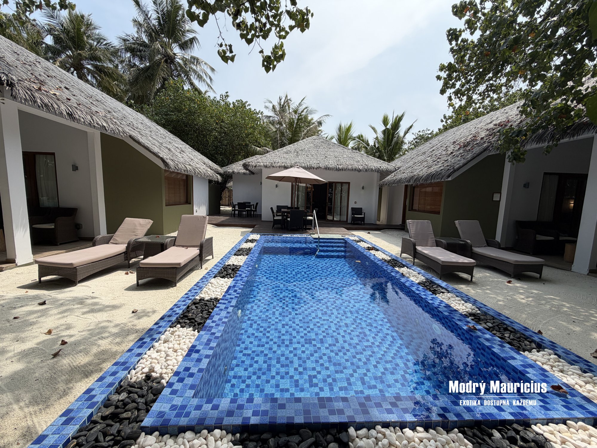 A hneď na začiatku prišlo veľmi milé prekvapenie – dostali sme upgrade na Cocoon Suite, čo je najvyššia kategória ubytovania. Cestovala som s rodičmi, takže to pre nás bolo úplne ideálne riešenie. Každý sme mali svoju vlastnú vilu, úplne oddelenú, ale zároveň nás spájala spoločná záhrada s veľkým bazénom. Okrem toho sme mali ešte jeden samostatný domček, ktorý slúžil ako obývačka s kuchyňou a kúpeľňou.