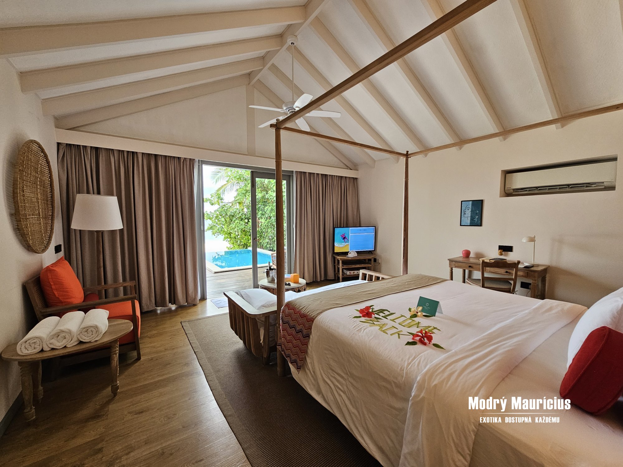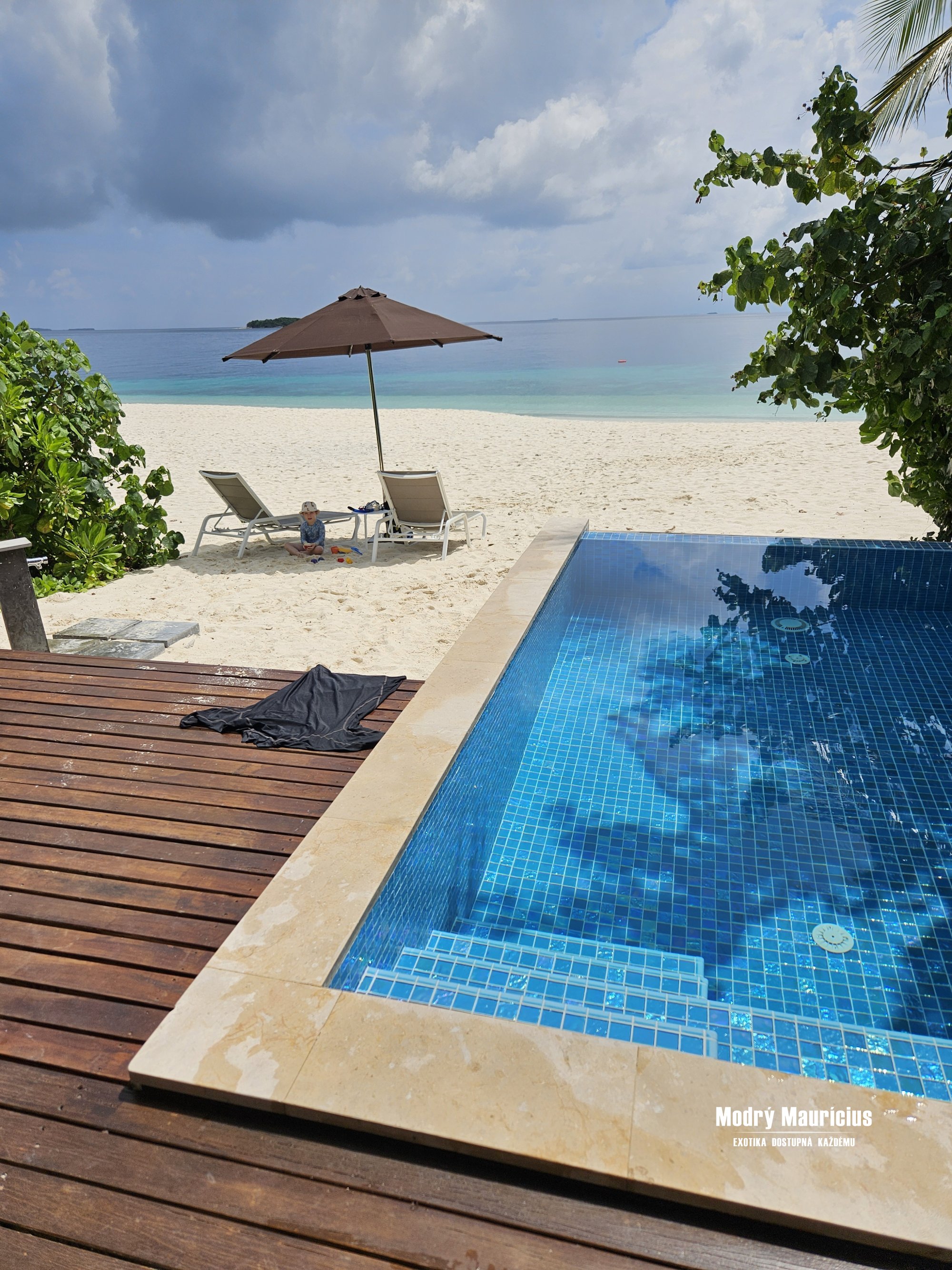 Bydleli jsme v plážové vile s bazénem, která se podle mě nachází v jedné z nejhezčích částí ostrova. Pláž je zde opravdu krásná a jen kousek od břehu začíná reef, takže šnorchlování je snadno dostupné přímo z pláže. Podmořský život byl velmi pestrý a nadchl i naši dceru, která si šnorchlování moc užila.