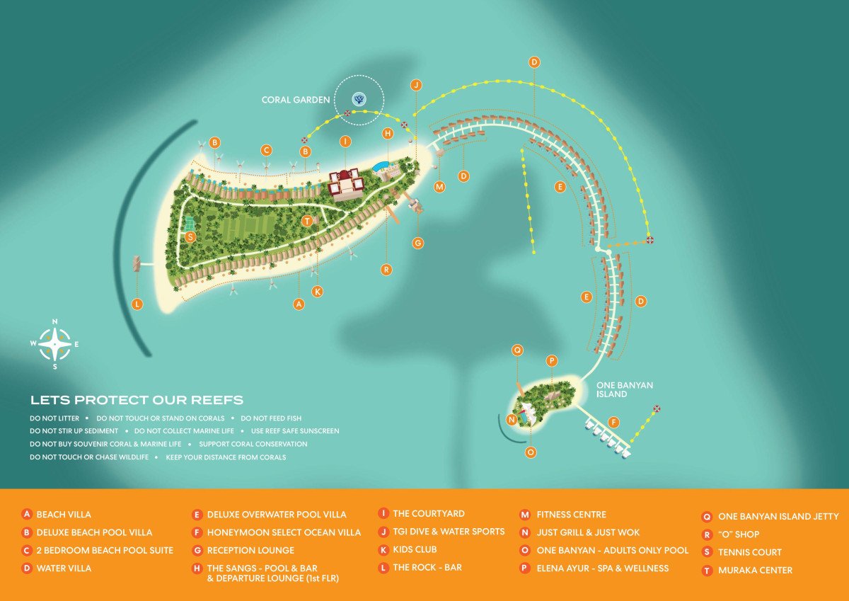 Resort se rozkládá na dvou tropických ostrůvcích obklopených tyrkysovou lagunou a korálovými útesy, které jsou propojené nadvodními vilami. Na hlavním ostrově se nachází většina plážových vilek, hlavní restaurace, bar i hlavní bazén. Menší ostrov One Banyan, určený pouze pro dospělé hosty, nabízí klidnější atmosféru se spa centrem, dvěma speciálními restauracemi a bazénem.