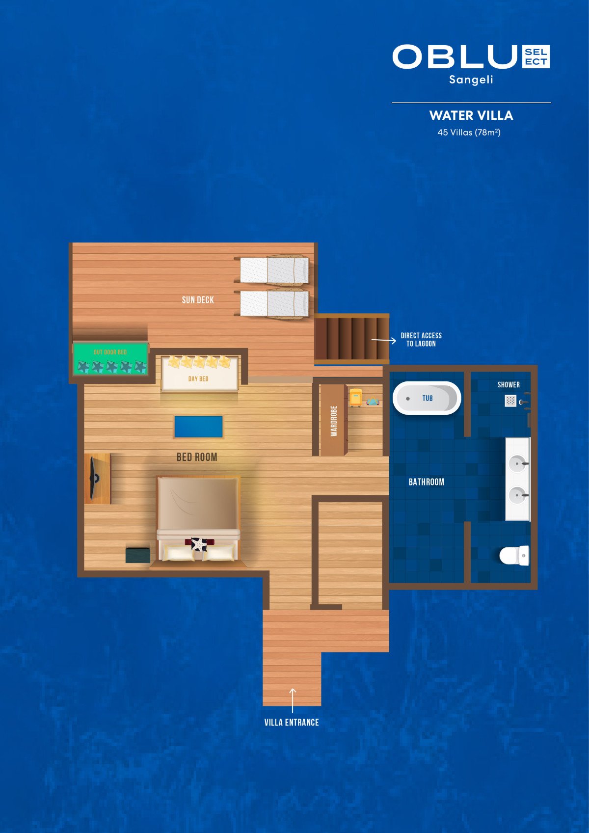 Water vily (78 m2) jsou umístěné přímo nad tyrkysovou lagunou a nabízejí klidné a romantické prostředí s nádhernými výhledy na oceán. Každá vila disponuje soukromou terasou s lehátky a přímým vstupem do laguny, takže si hosté mohou užívat koupání nebo šnorchlování přímo ze své vily. Prostorný interiér a elegantní design vytvářejí ideální zázemí pro odpočinkovou dovolenou v tropickém ráji.