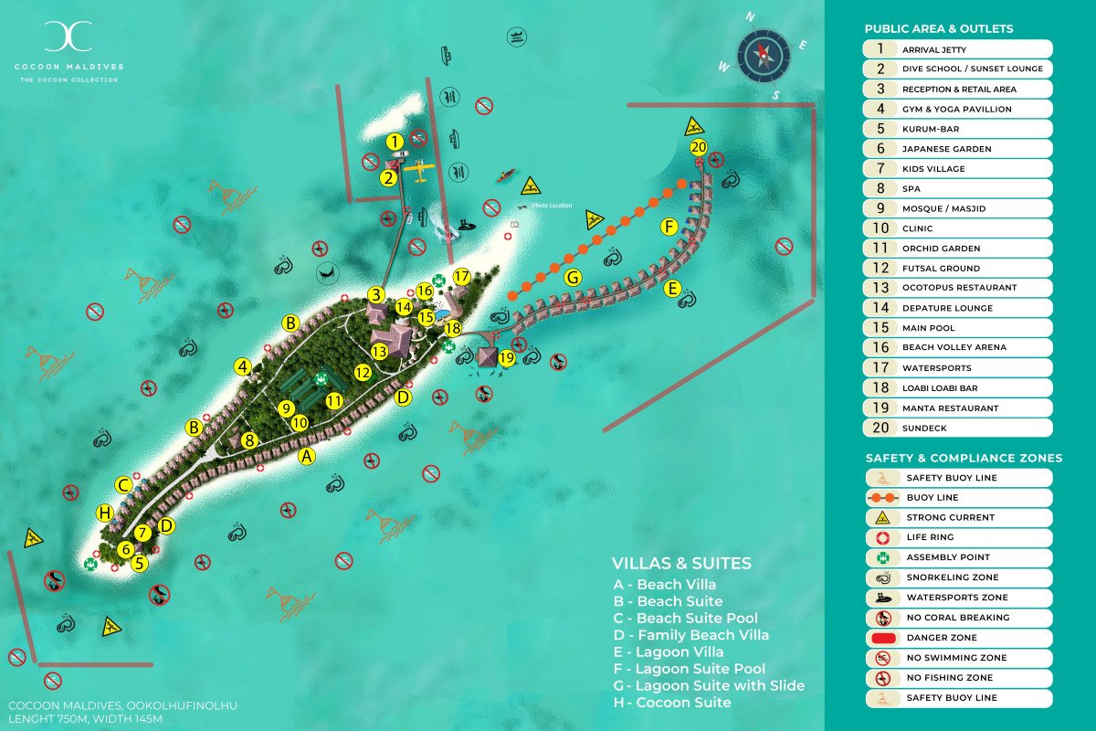 Rezort Cocoon Maldives sa nachádza na piesočnatých plážach ostrova Ookolhufinolhu, ktorý zahŕňa plochu 7 hektárov a meria 600x100 metrov. Ostrov leží v atole Lhaviyani, ktorý je od medzinárodného letiska v Male vzdialený 30 minút letu hydroplánom. Prostredie rezortu je skutočne prekrásne. Malebná lagúna a rozľahlé pláže vytvárajú perfektné miesto pre romantickú i rodinnú dovolenku, svadby a iné zvláštne príležitosti. Ostrov poskytuje možnosť nezabudnuteľného potápania a šnorchlovania vďaka nedotknutým koralovým útesom, ktoré sú domovom majestátnych mánt, delfínov a morských korytnačiek. Po celý rok je preslnený Lhaviyani atol ovievaný slabým osviežujúcim monzúnom a obmývaný príjemne teplými vodami Indického oceánu, čo z neho robí perfektnú destináciu pre Vašu dovolenku.